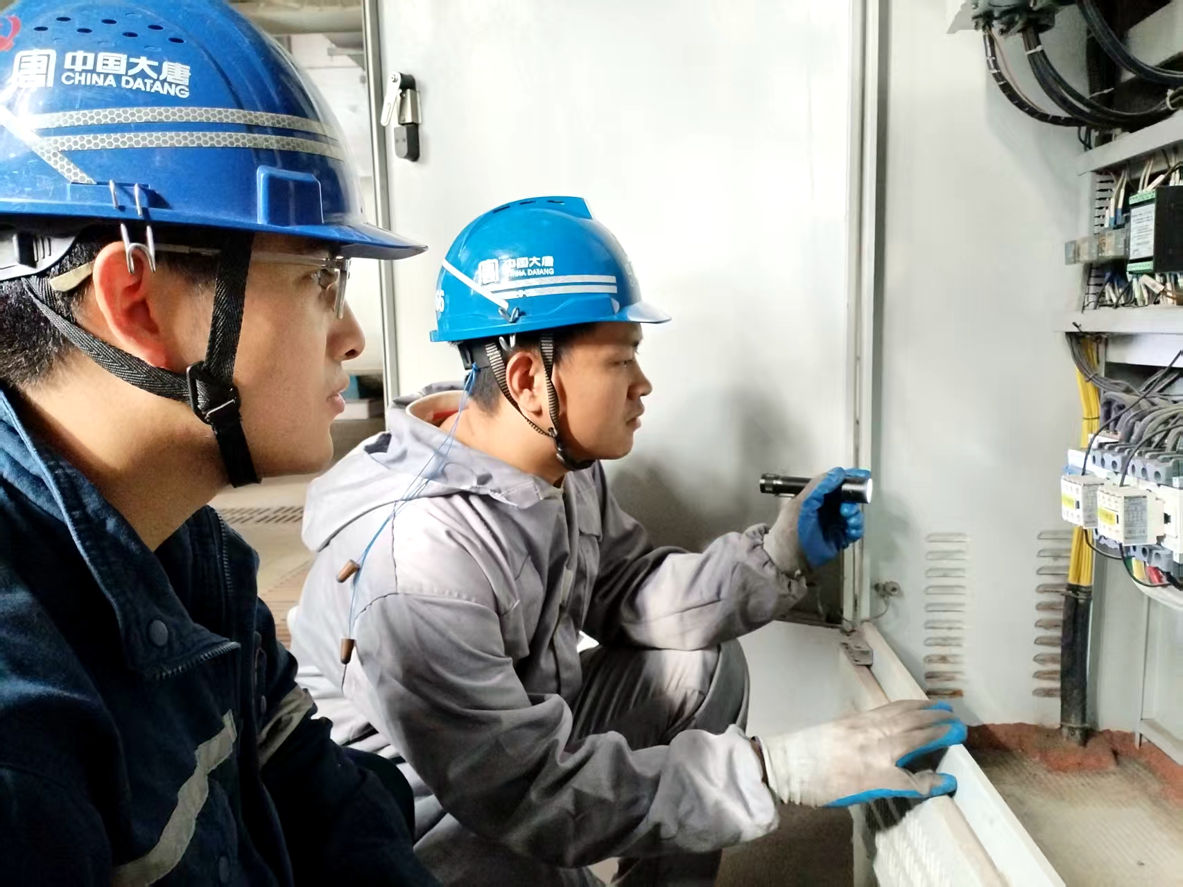 天邊烏云彌漫,雨還在一直下個(gè)不停。一行人深一腳淺一腳?過(guò)周邊的泥濘,抵達(dá)中水泵控制箱處。雨絲鞭打著電氣班長(zhǎng)小管沉穩(wěn)的面龐,他鉆在防雨棚下,借著手電的光,仔細(xì)地查看著控制柜內(nèi)的情況。