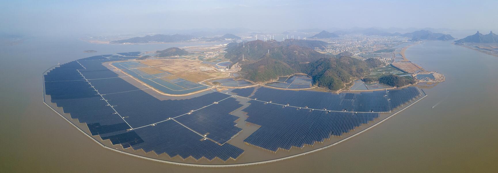 東海之濱象山縣高塘島鄉(xiāng),國內(nèi)首個(gè)大型海岸外灘涂光伏電站--長大涂光伏電站--;60多萬塊光伏組件在陽光下熠熠生輝。該電站每年可生產(chǎn)清潔能源2.9億千瓦時(shí),減排二氧化碳24萬噸,相當(dāng)于種植13萬顆樹。